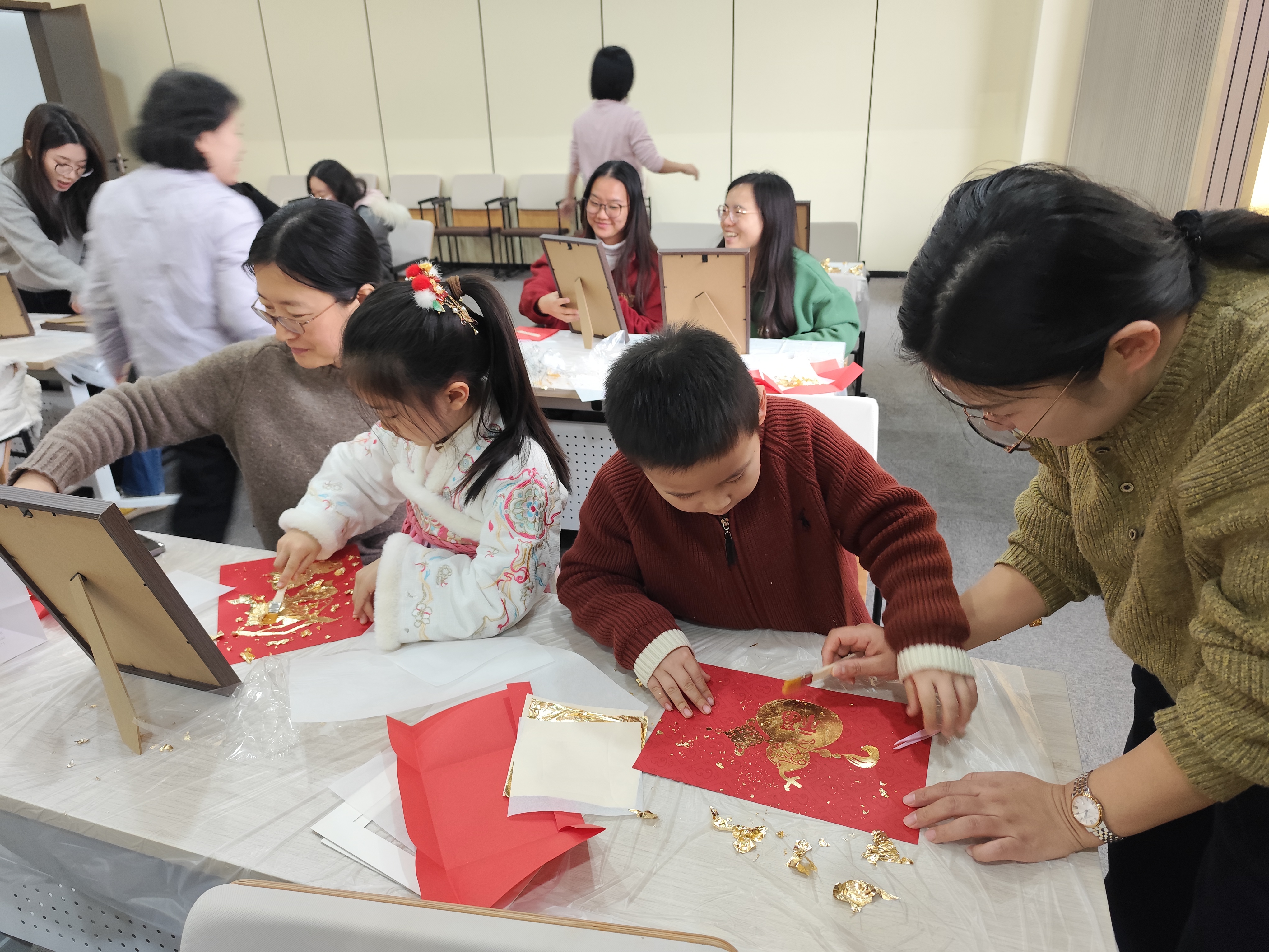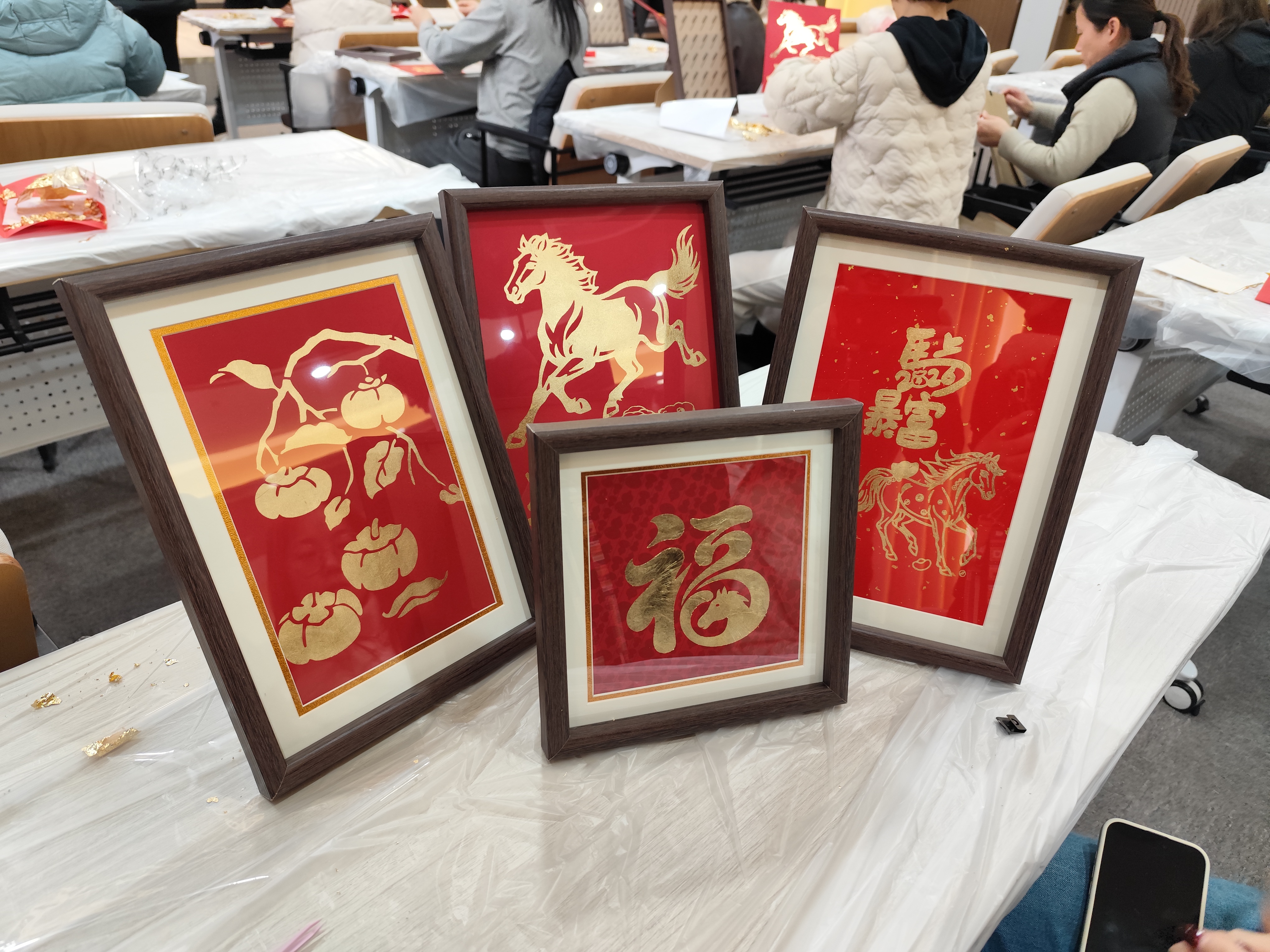 实操环节,老师们化身“金箔匠人”。贴金、扫箔、装框,金屑飞扬间,一幅幅金箔画陆续完工,“柿柿如意”“马到成功”“马上有福”等跃然纸上,金辉与笑靥交相辉映。